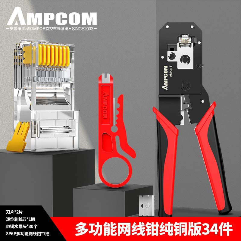 AMPCOM水晶头网线钳套装网络工具多功能网钳家用工程8P6P电话钳318纯铜版34件AM318034