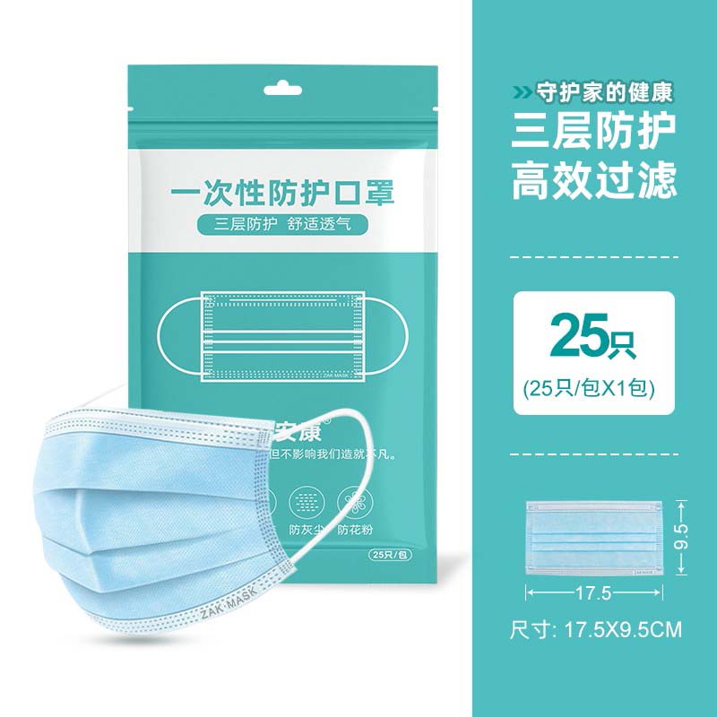 职安康一次性白色囗罩成人含熔喷布防尘防飞沫三层蓝色防飞沫粉尘雾霾花粉透气防护口罩男女 三层蓝色(25只/1包)