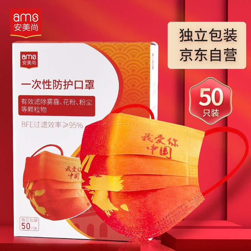 安美尚 ams A9501我爱中国红一次性口罩独立包装拜年国潮个性50只装 我爱你中国口罩