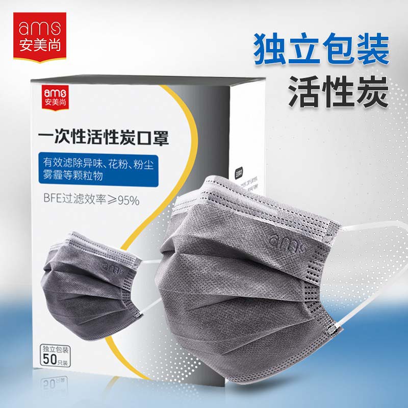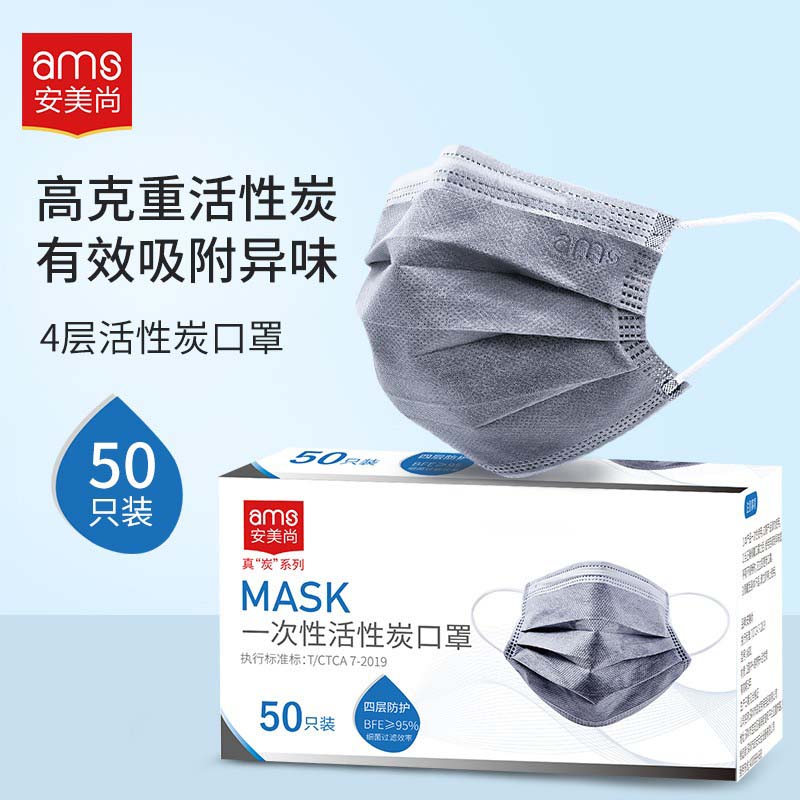 安美尚(ams)一次性活性炭口罩防甲醛异味防尘四层防护口罩透气防飞沫粉尘50只装