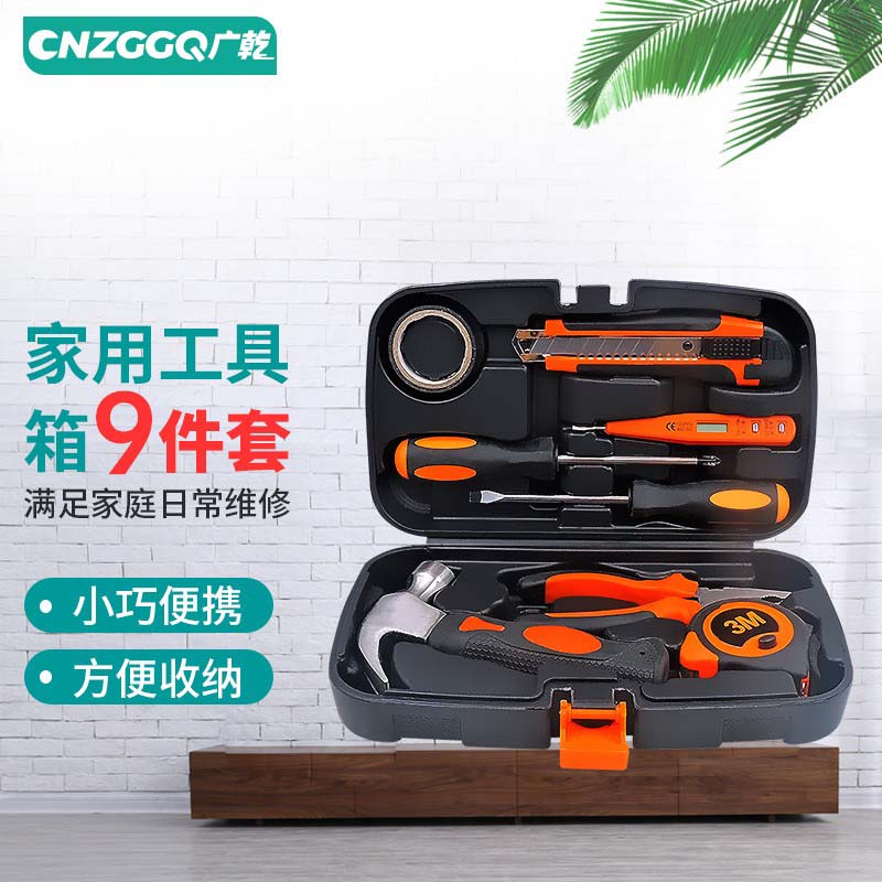 家用工具箱套装维修工具组套锤子9件套工具套装五金工具盒榔头老虎钳子螺丝刀电笔卷尺美工刀工具箱套装9件套