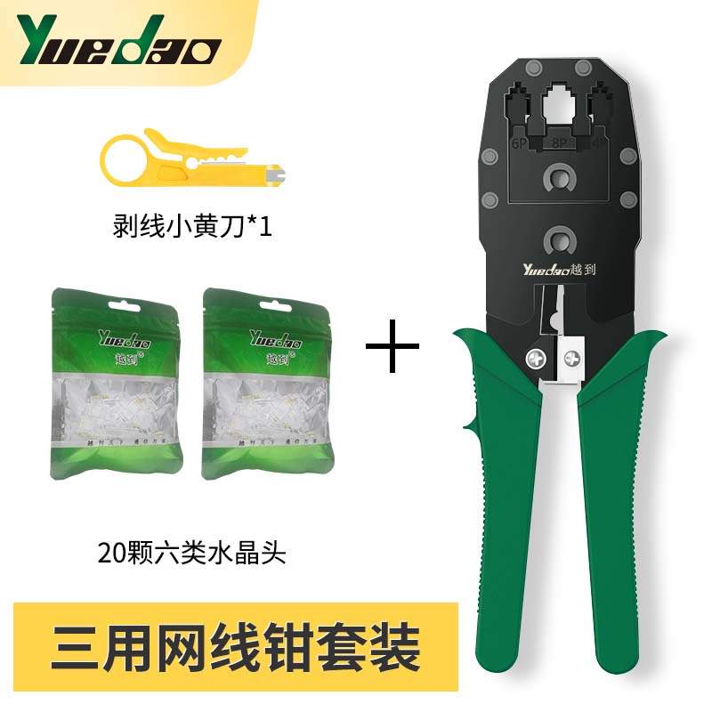 YueDao网线钳套装七类网线钳子超六类压线钳6类水晶头压接钳网络夹线工具剥线钳燕尾夹穿孔三用网线钳+小黄刀+20颗六类水晶头
