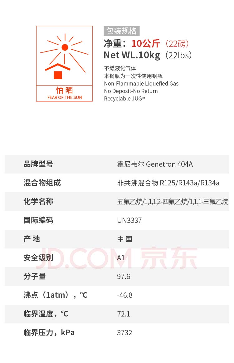霍尼韦尔(Honeywell)R404A制冷剂氟利昂环保雪种冷媒净重10kg1瓶
