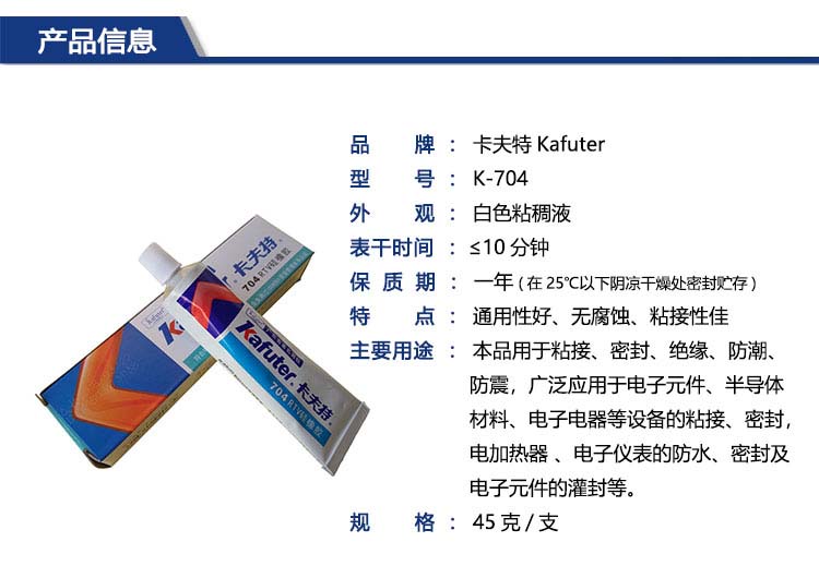 卡夫特 kafuter K-704 有机硅密封胶 单组份室温固化硅橡胶 电子胶 白色 45克/支
