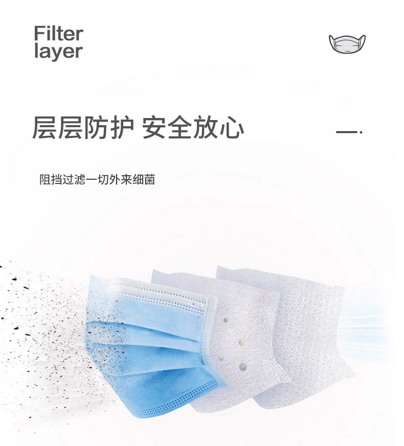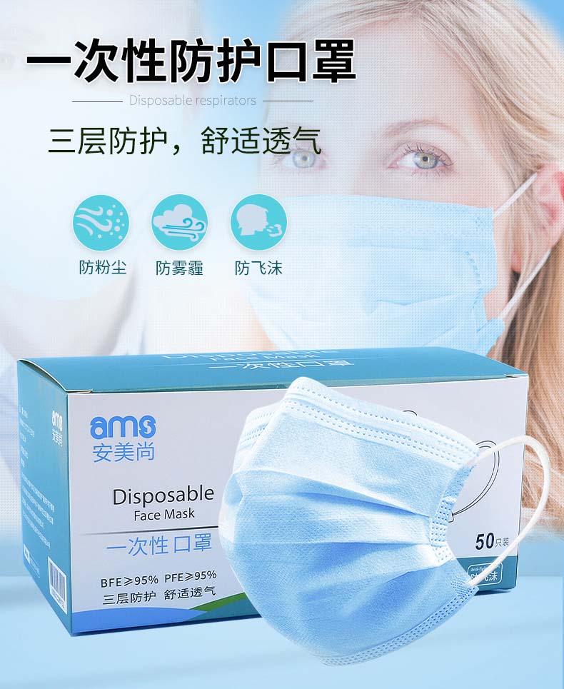 安美尚(ams)一次性防护口罩 防飞沫透气防粉尘三层防护熔喷布大人学生口罩50只装 白色--成人款50只装(耳戴式