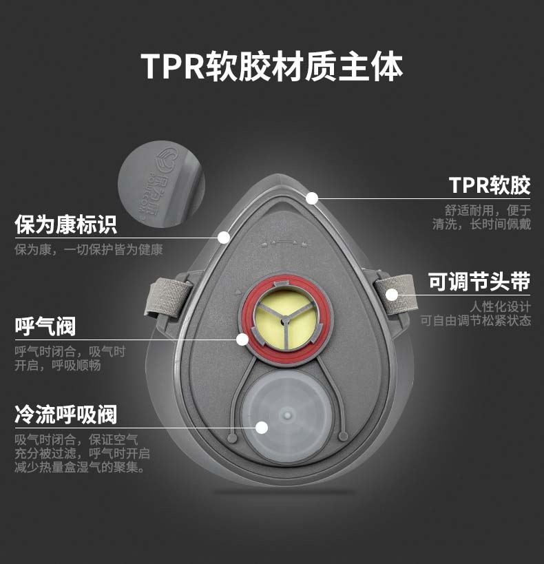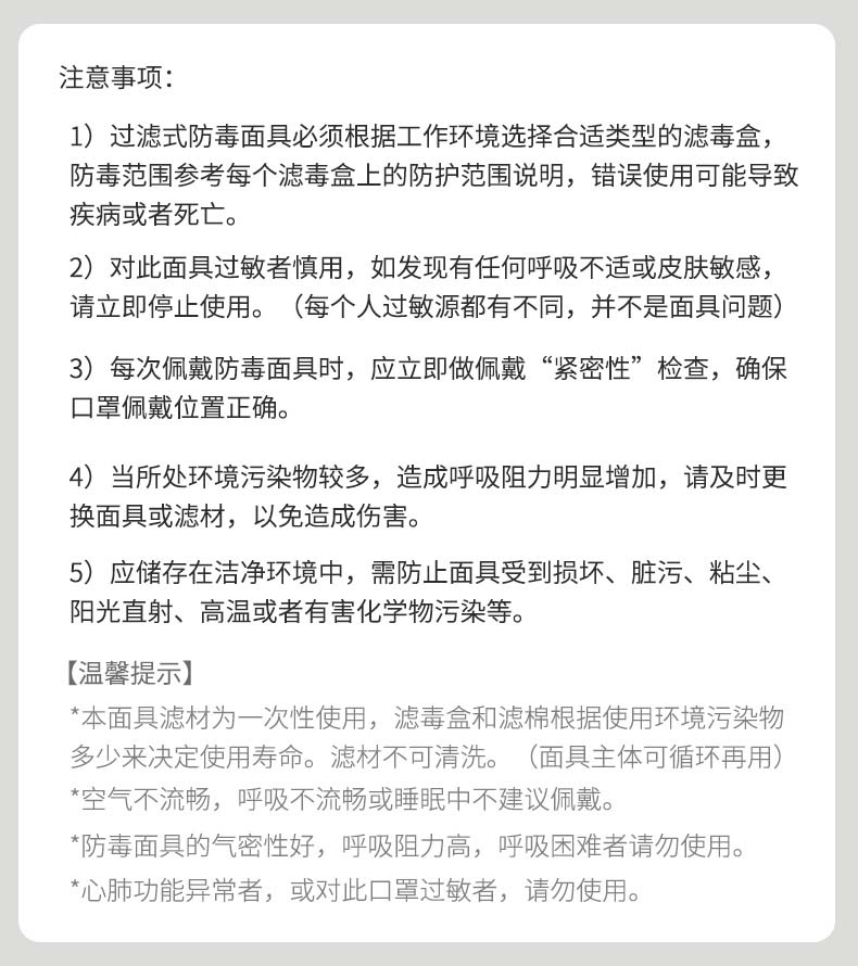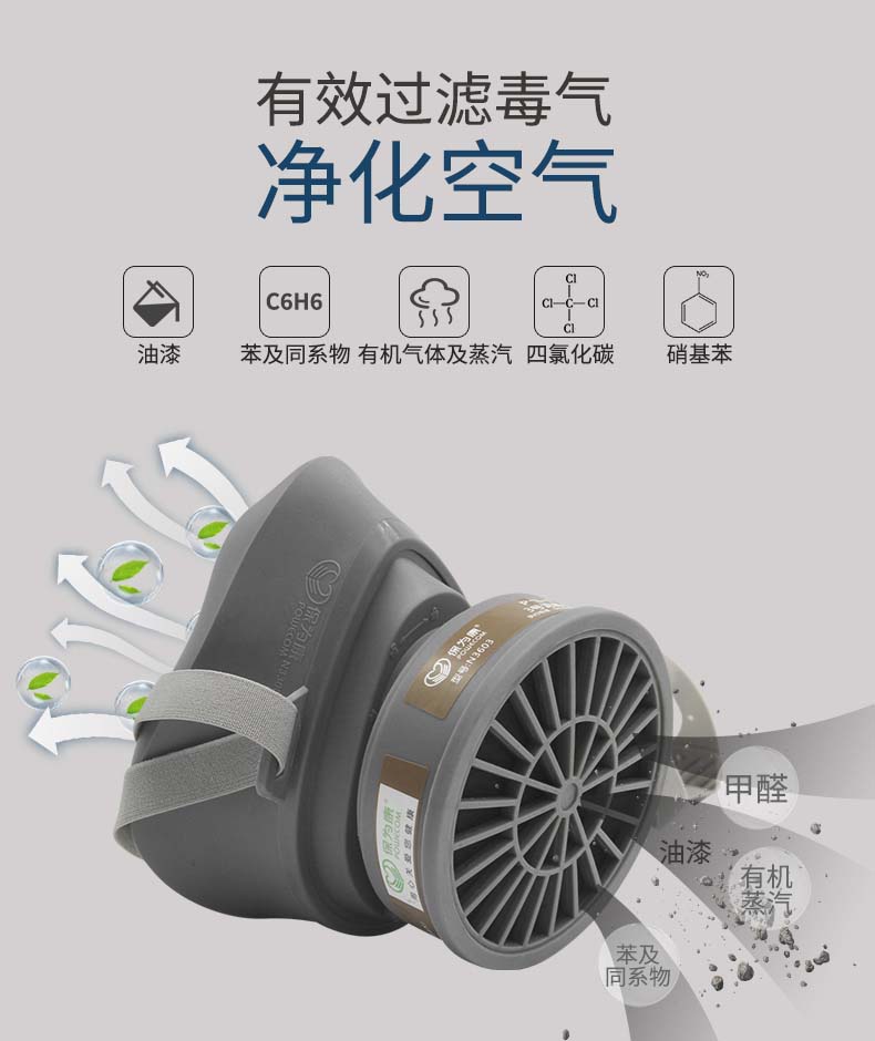 防护类型:有机气体,酸性气体,二氧化硫,氨气,汞蒸汽,粉尘,一氧化碳,PM2.5,二氧化氮,一氧化氮,硫化氢,无机气体,蒸汽