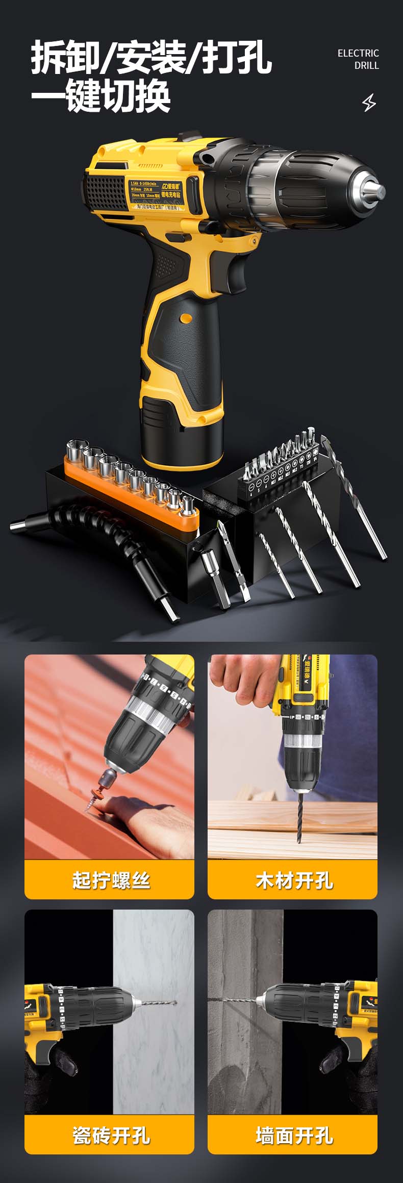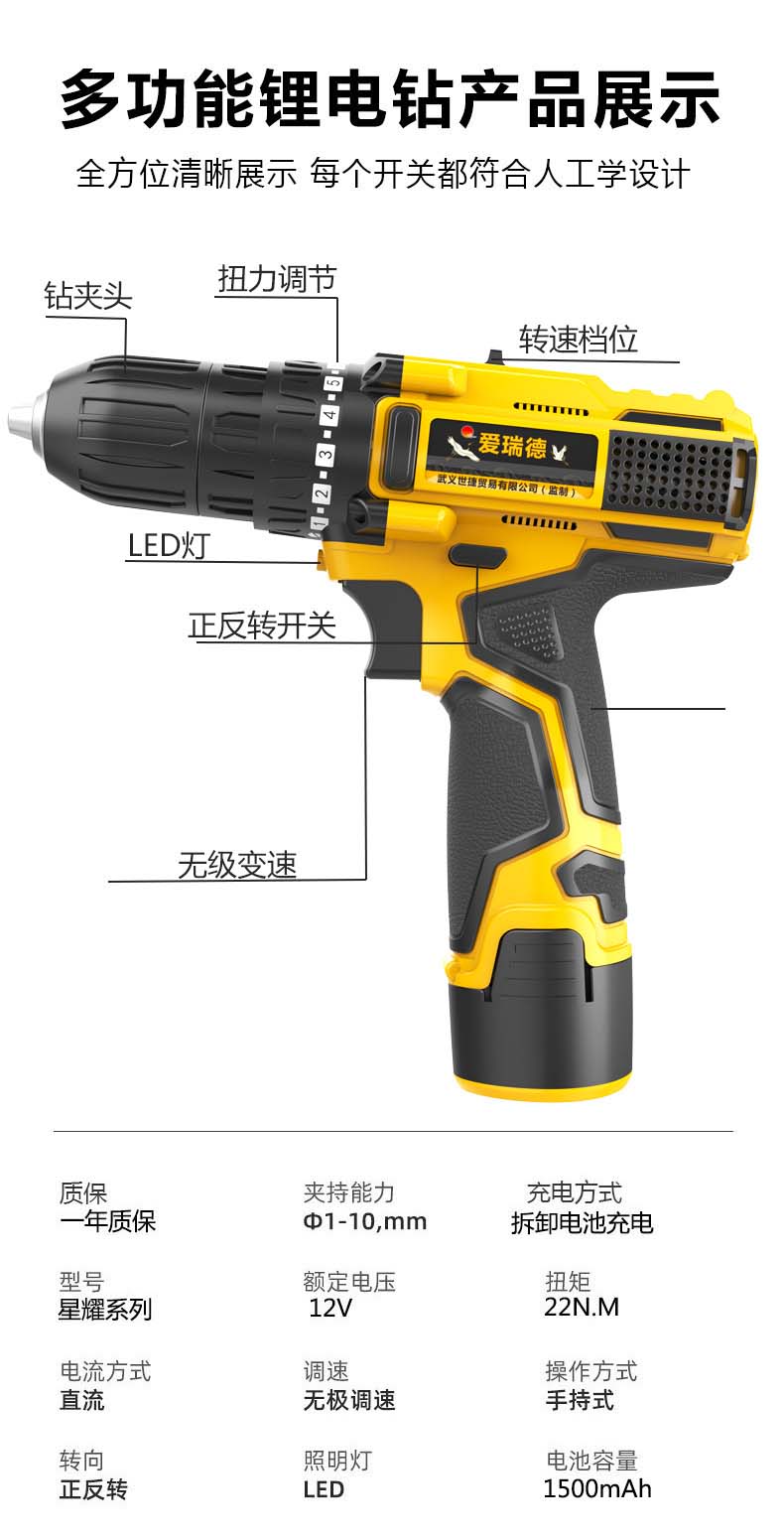 德国爱瑞德12V锂电手电钻家用电动螺丝刀充电钻多功能电起子 电动工具 12V星耀款(二电一充)