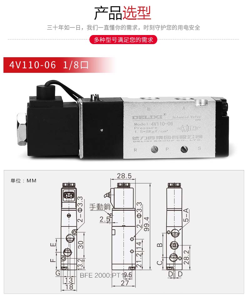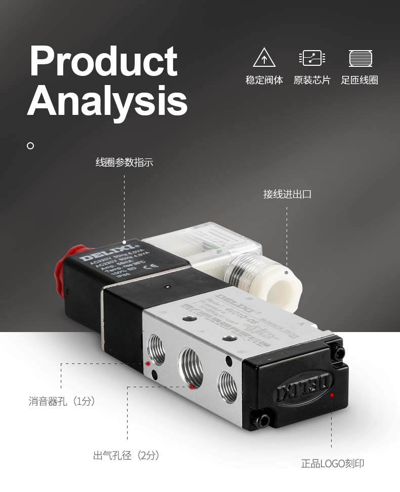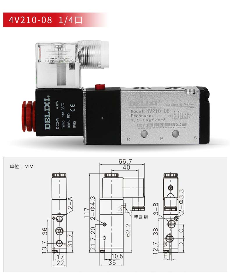 商品名称:德力西电磁阀气动电磁控制阀AC220V线圈 DC24V换向气阀 单电控 两位五通 4v210-08 交流220V