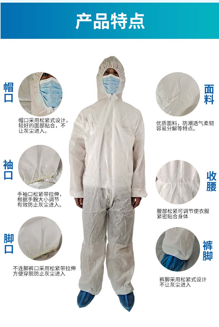 商品名称:一次性防护服连体带帽无纺布防尘服打磨喷漆养殖工作服酵素浴 PP深蓝色连帽连脚 XXXL