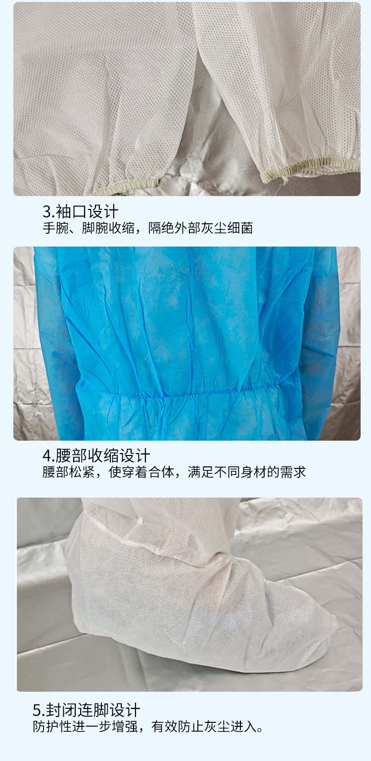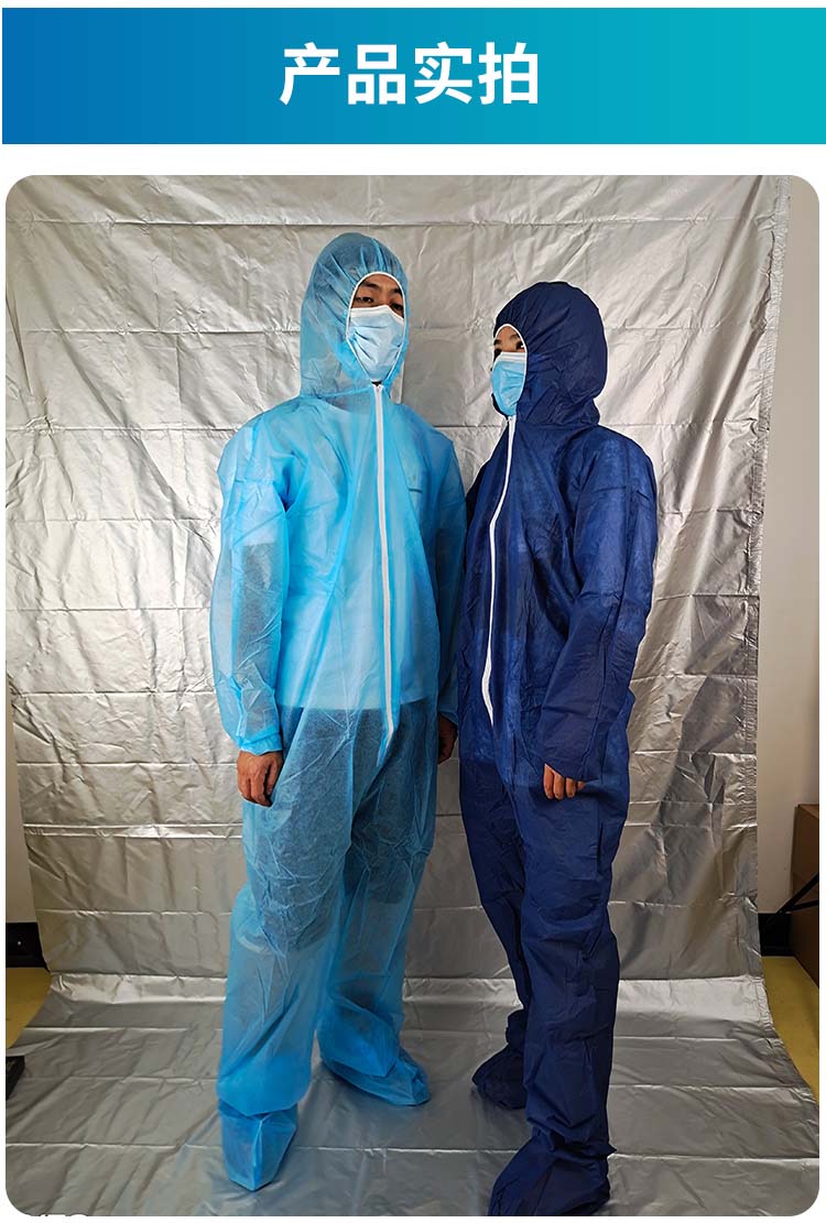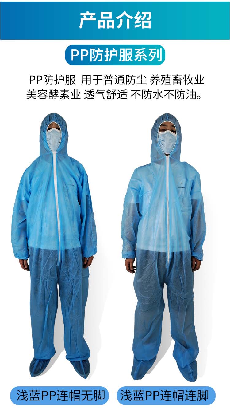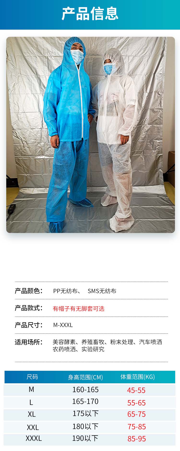 商品名称:一次性防护服连体带帽无纺布防尘服打磨喷漆养殖工作服酵素浴 PP浅蓝色连帽无脚套 XXXL