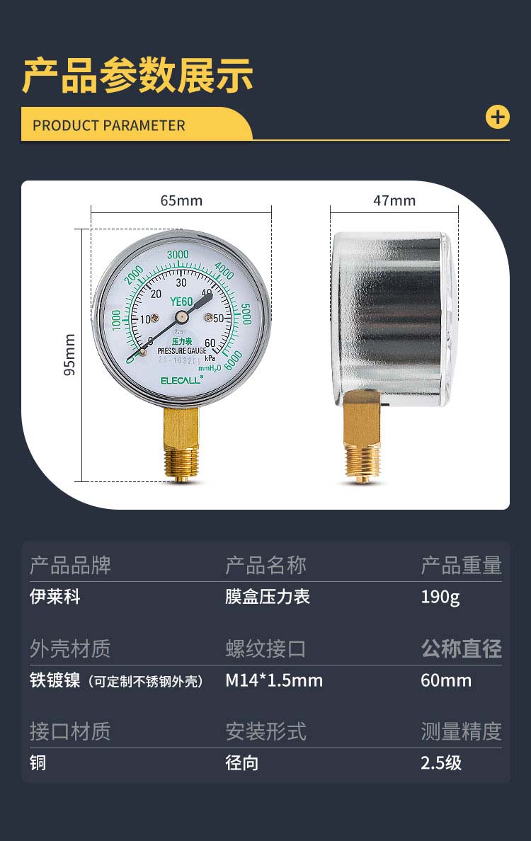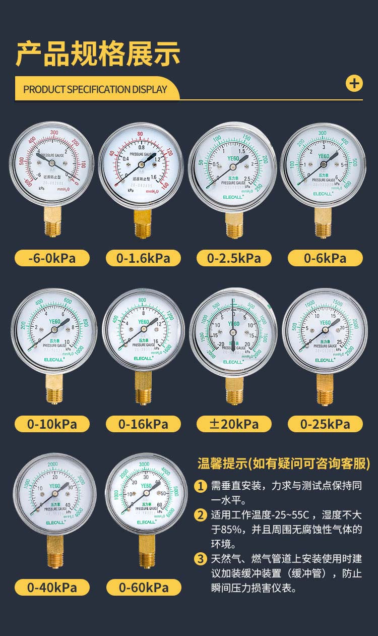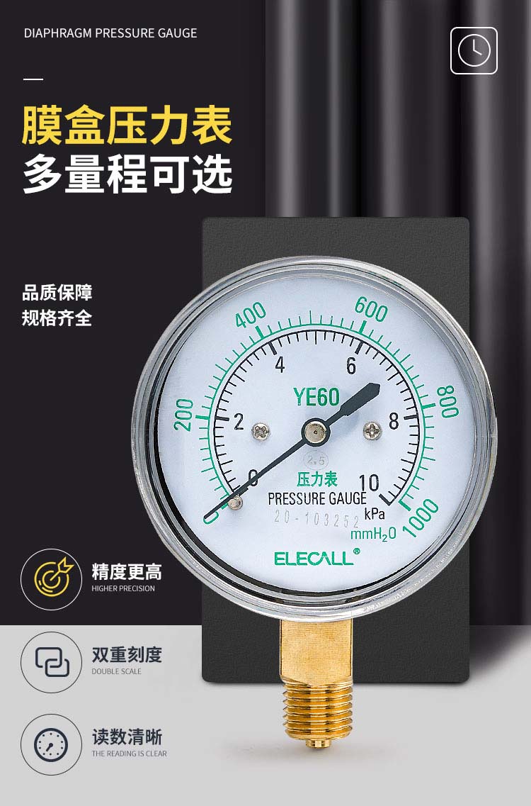 伊莱科(ELECALL)膜盒压力表 0-60KPA 燃气表负压表千帕表真空表微压表