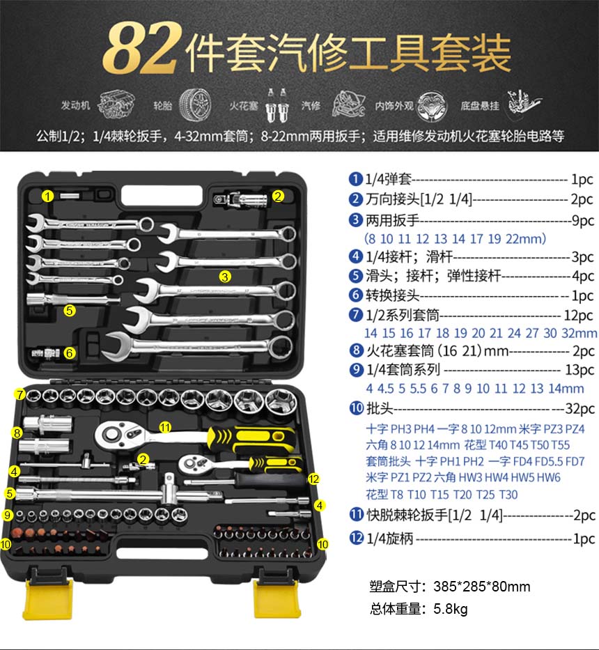 全亚汽修工具套装套筒套管棘轮扳手万能修车汽车维修修理工具箱组合多功能【随车常备高挡】;46件小飞工具套装