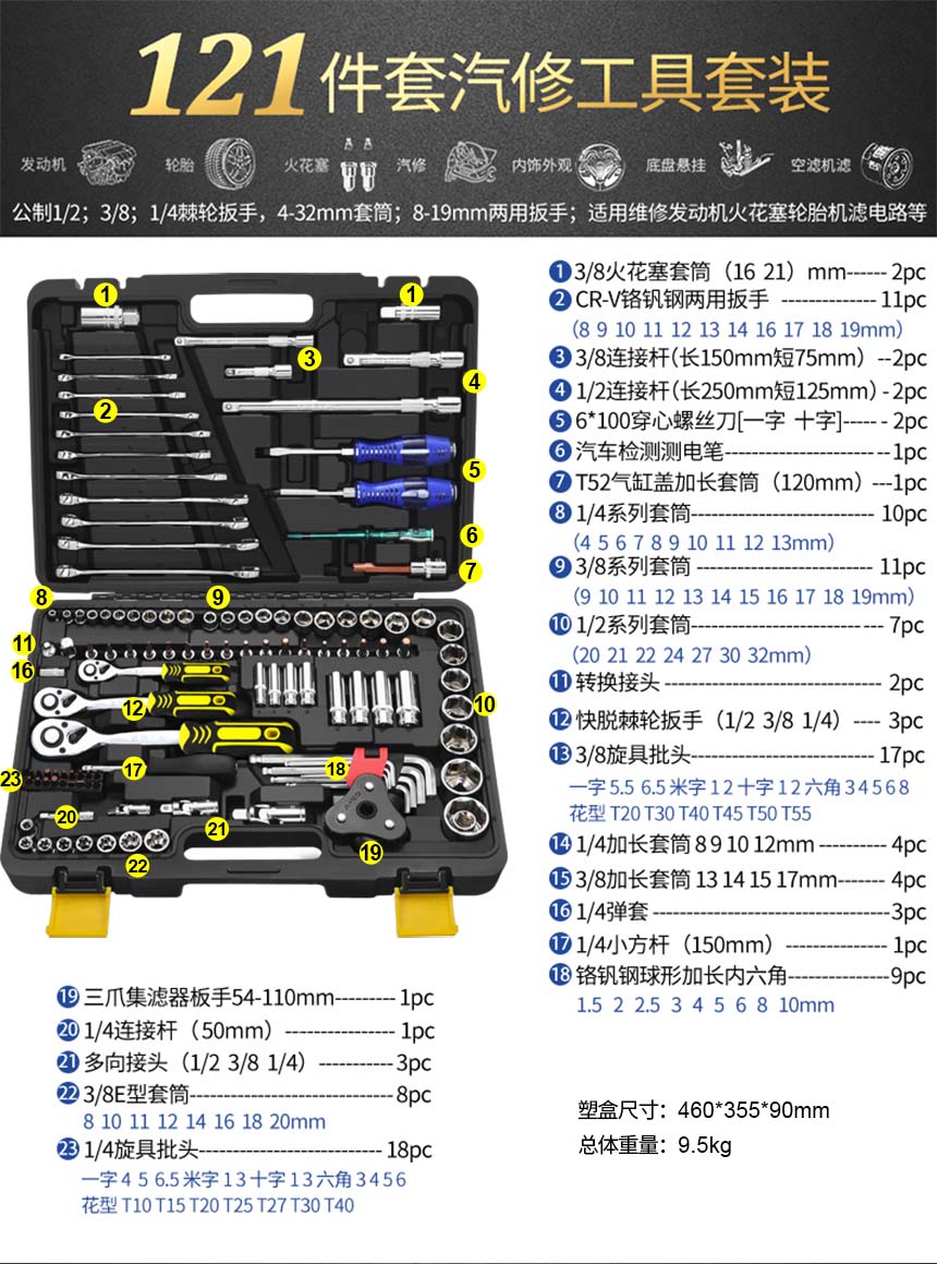 商品名称:全亚汽修工具套装套筒套管棘轮扳手万能修车汽车维修修理工具箱组合多功能【随车常备高挡】;46件小飞工具套装