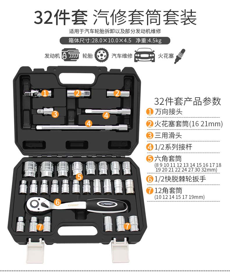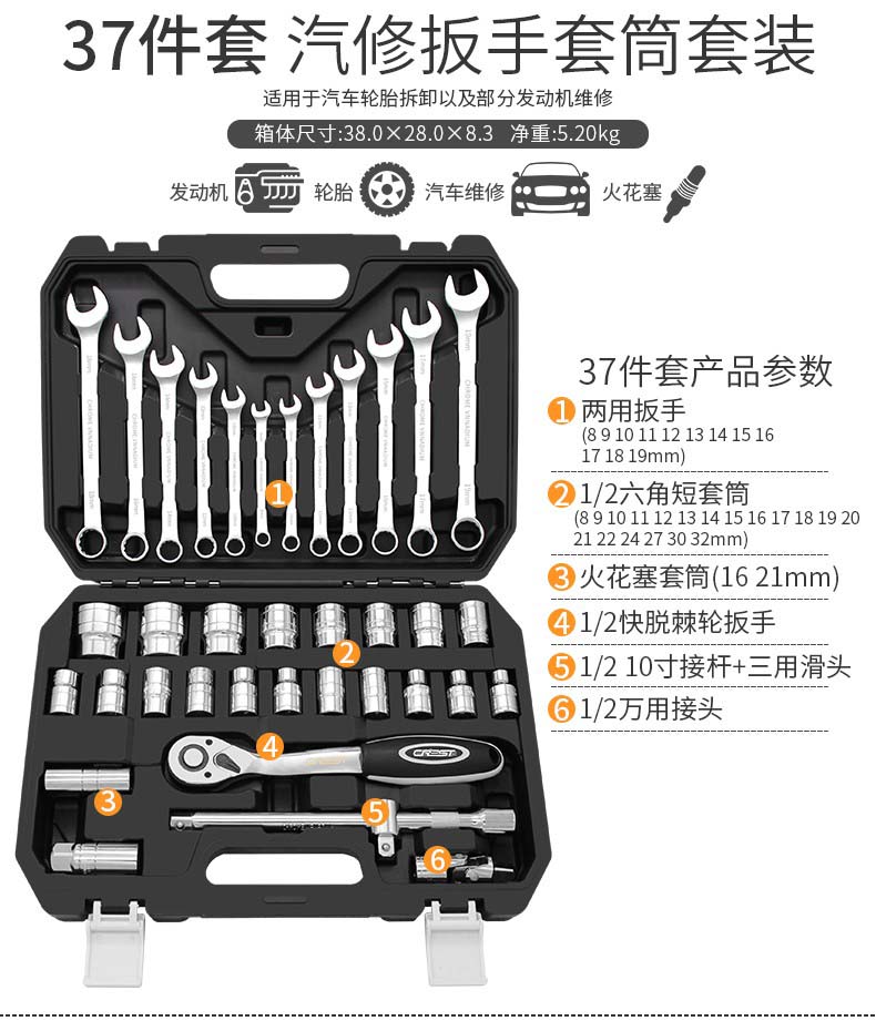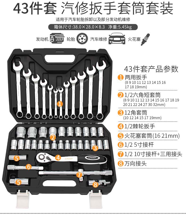 商品名称:汽修工具套装套筒套管棘轮扳手万能修车汽车维修修理工具箱组合多功能46件套小飞工具套装【看图二】