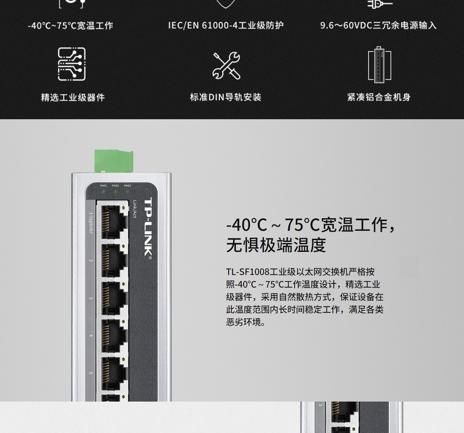 商品名称:TP-LINK普联工业级以太网交换机5口8口百兆千兆企业/监控网络分流器分线器集线器tp交换器 TL-SF1008工业级 8口百兆