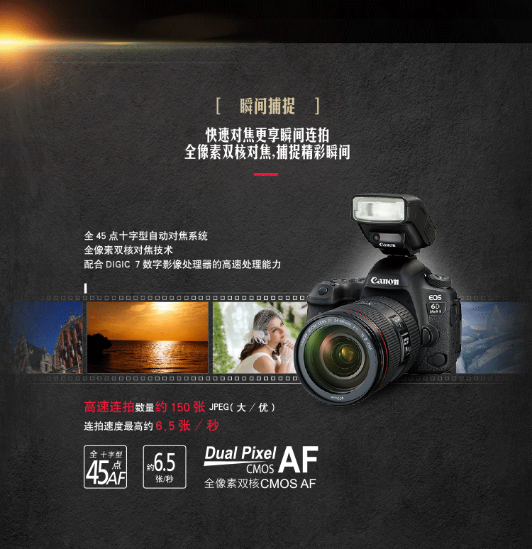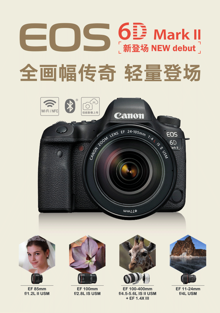 佳能 6D Mark II 数码照相机 (EF 24-105mm f/4L IS II USM 镜头/128G高速卡/原装包/云腾880/原装电池/清洁套装/天利77mm滤镜 )
