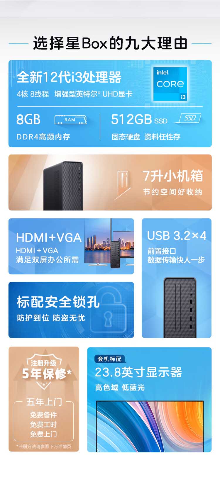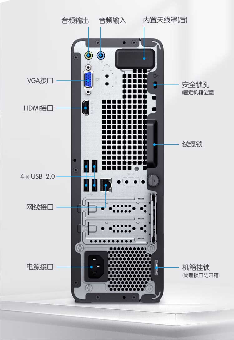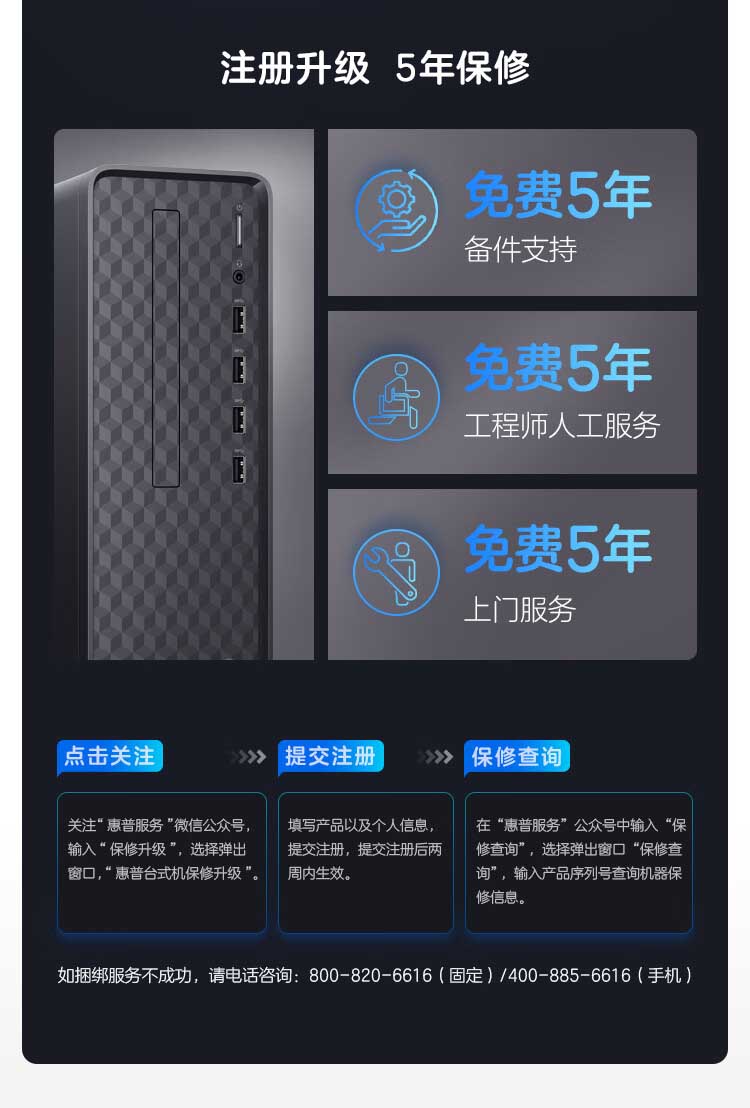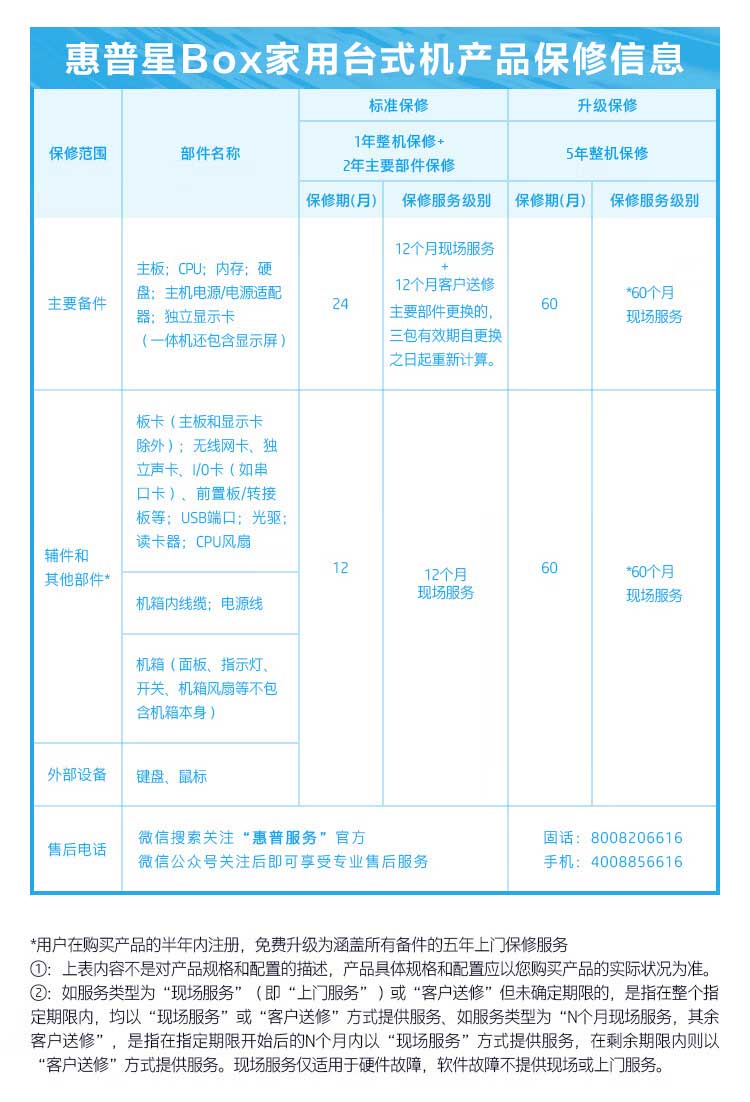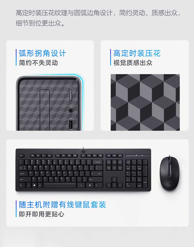 包装清单:台式机 x1,电源线 x1,保修卡 x1,有线键盘 x1,有线鼠标 x1